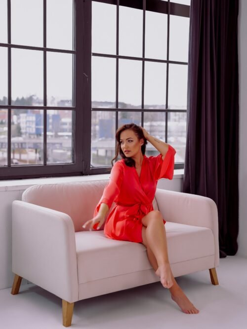 Koralinės spalvos kimono chalatas